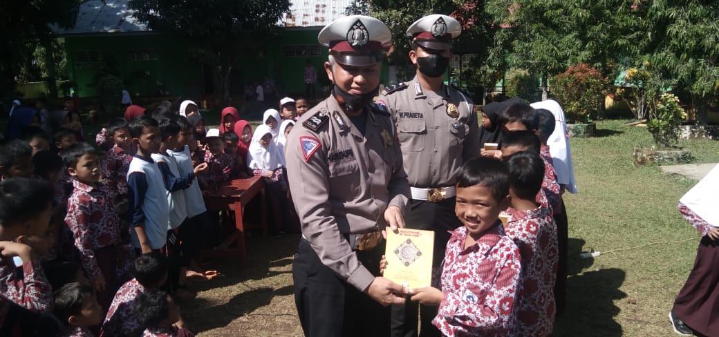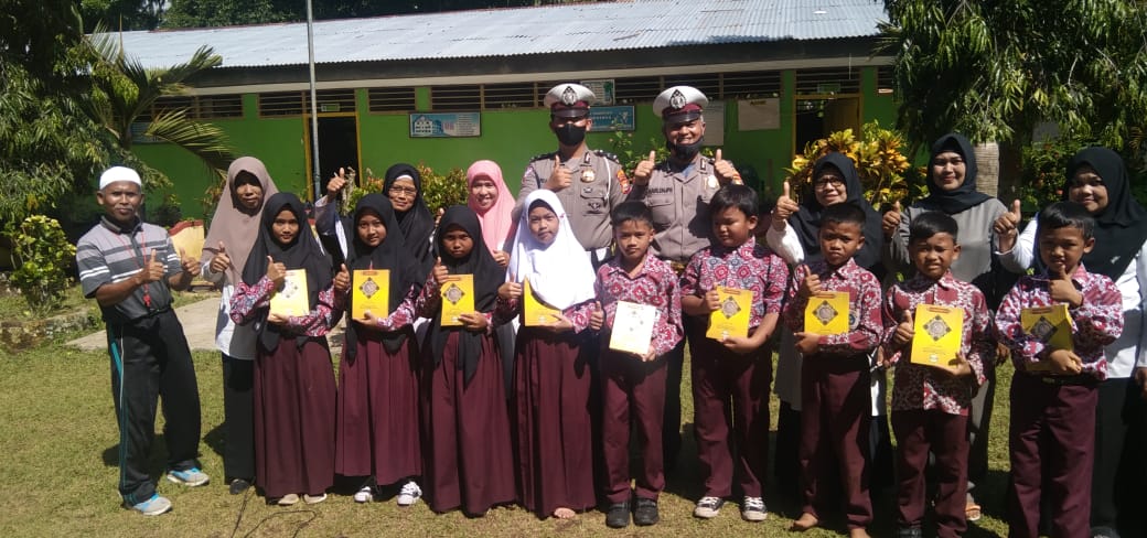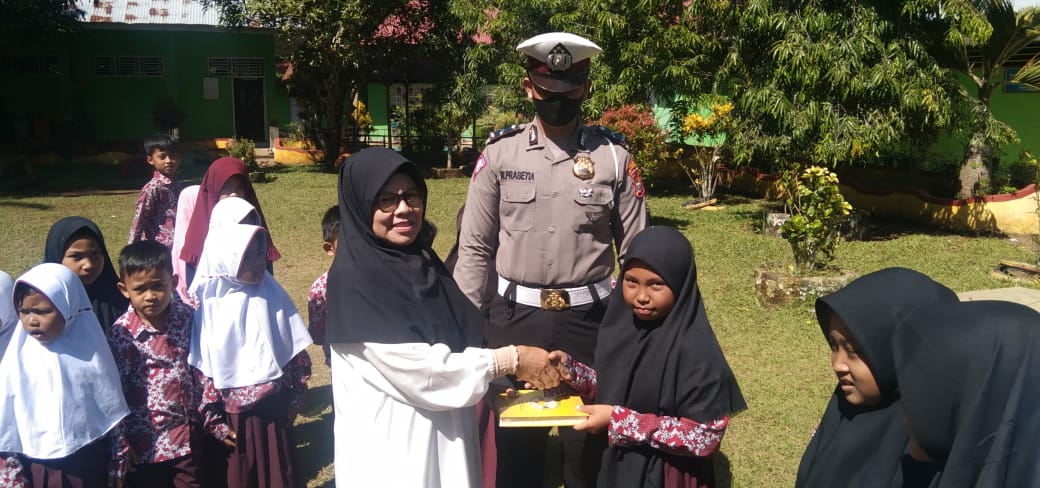 Dalam kegiatan itu personil Satlantas Polres Mukomuko AIPTU Harlensi SH dan Bripda Widi Prasetia usai sosialisasi memberikan kuis terkait tertib lalu lintas yang baru saja disampaikan kepada para murid murid di SDN 02 Air Manjuto.