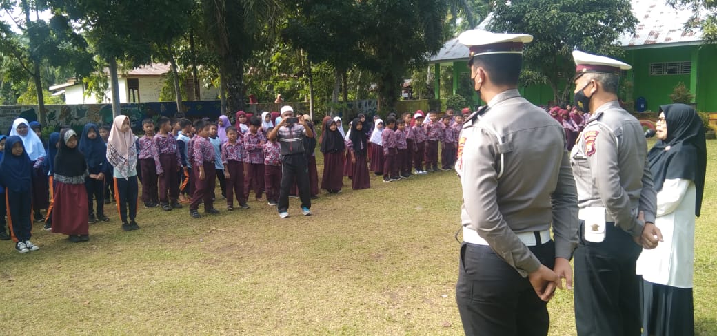 Kabar Bengkulu – Personel Polres Mukomuko dari Satlantas Polres Mukomuko AIPTU Harlensi.SH dan BRIPDA Widi Prasetia menggelar Sosialisasi Tertib Lalulintas kepada para murid di SDN 02 Air Manjuto, di lapangan Sekolah 02 Air Manjuto, Desa Manjunto Jaya, Kecamatan Air Manjuto, Kabupaten Mukomuko, Rabu (27/7/22).