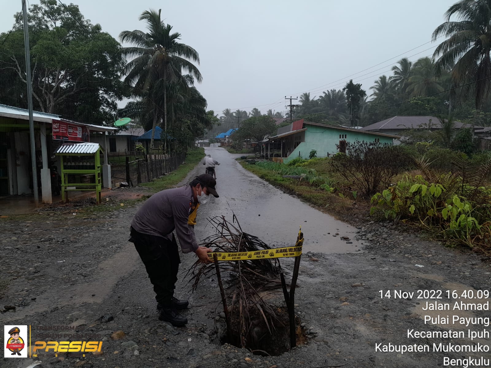 Menindaklanjuti laporan warga masyarakat melalui Call Center Polsek Mukomuko Selatan, Kapolres Mukomuko, melalui Kapolsek Mukomuko Selatan, , IPTU Firman Syahputra,SH,MH gerak cepat mengintruksikan anggota Polsek Mukomuko Selatan yang piket jaga , Briptu Vebi Asmadi untuk segera memasang Police line di tempat jalan yang berlubang.