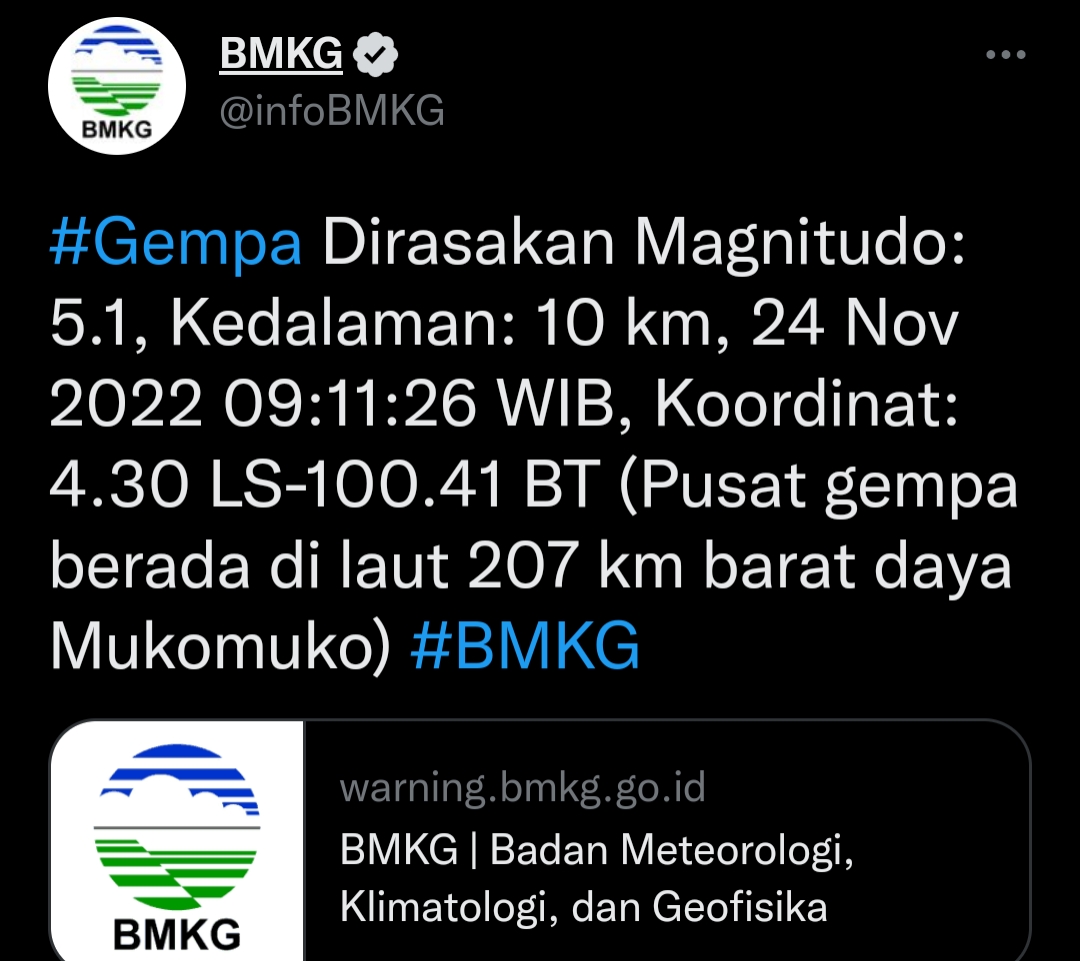 Kabar Bengkulu, Mukomuko – Gempa magnitudo 5,1 mengguncang Kabupaten Mukomuko, Bengkulu. Kedalaman gempa 10 Km. Informasi resmi BMKG menyampaikan gempa terjadi pukul 09.11 WIB, Kamis (24/11/2022). Pusat gempa berada di 207 km Barat Daya Kabupaten Mukomuko Bengkulu.