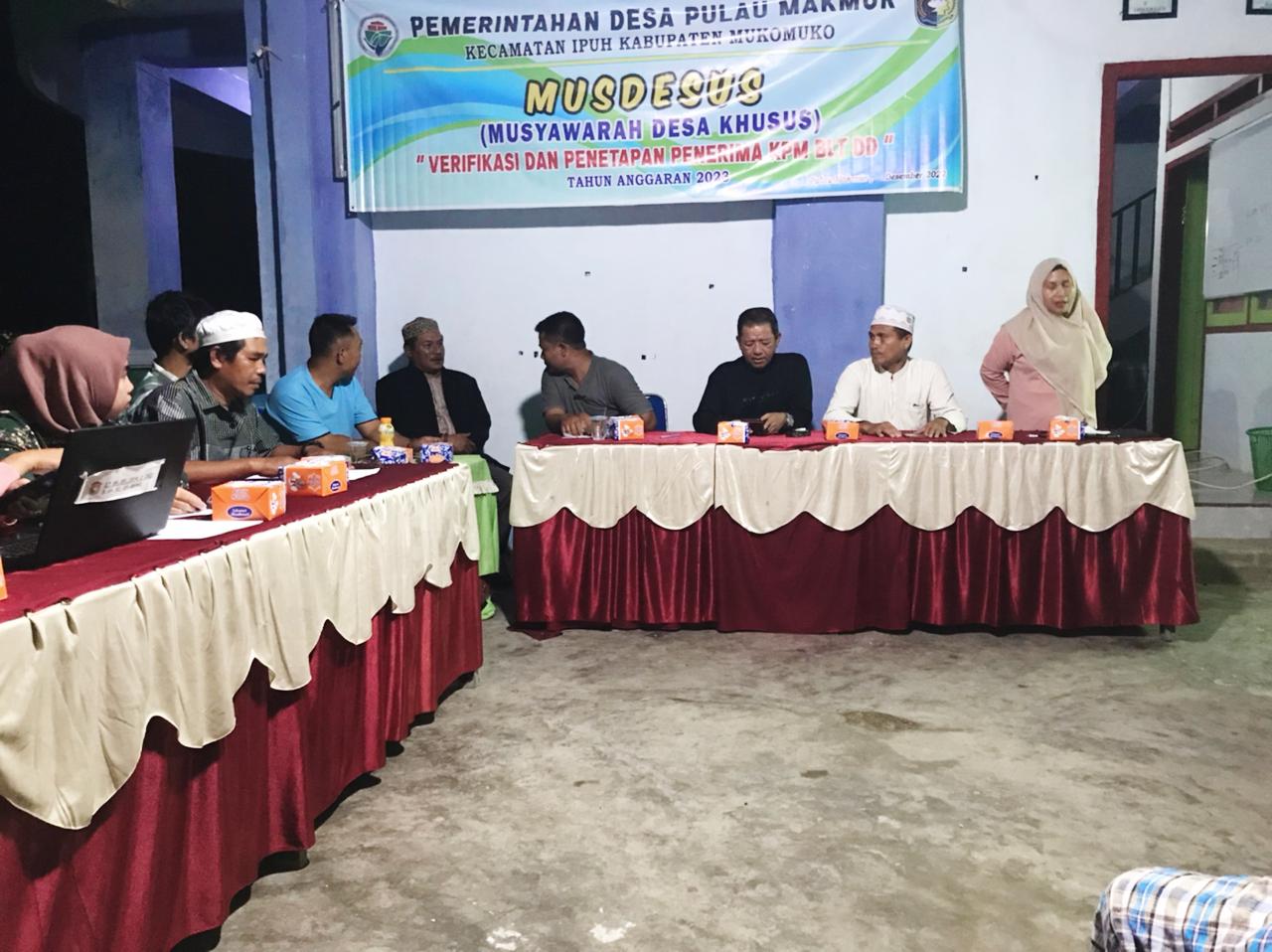 Pemerintah Desa Pulau Makmur Kecamatan Ipuh Kabupaten Mukomuko mengelar Musdessus Verifikasi & penetapan penerima Keluarga Penerima Manfaat (KPM) BLT-DD tahun 2023. Bertempat di Aula Kantor Desa Pulau Makmur. Sabtu malam ( 24/12/22). Turut hadir Kasi Ekobang Kecamatan Ipuh,Kepala Desa Pulau Makmur beserta perangkat, BPD, Tokoh masyarakat dan warga peserta kegiatan.
