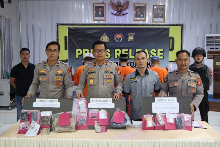 Kapolres Mukomuko AKBP Nuswanto SH SIK MH yang didampingi Kasi Humas Ipda Agus Cik, S. I. KOM, KBO Sat Narkoba Iptu O Gea, S. H, Paur Dalops Bag Dalops Ipda M. Sofyan, S. K. Kom. Dalam kesempatan itu Kapolres Mukomuko memaparkan bahwa 2 tersangka merupakan warga Mukomuko dan seorang tersangka warga Rokan Hilir Riau.