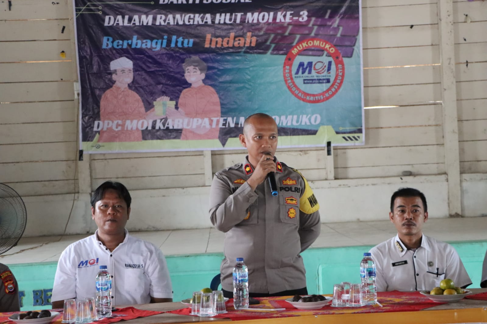 “Polres Mukomuko mengapresiasi kepada MOI Mukomuko atas berbagai kegiatan Bakti Sosial yang telah dilakukan selama ini, semoga di umur yang ke 3 tahun ini MOI Mukomuko semakin sukses dan semakin eksis dalam menyajikan pemberitaan yang bersinergi dengan Pemerintah khususnya dengan Polres Mukomuko,” ungkapnya.