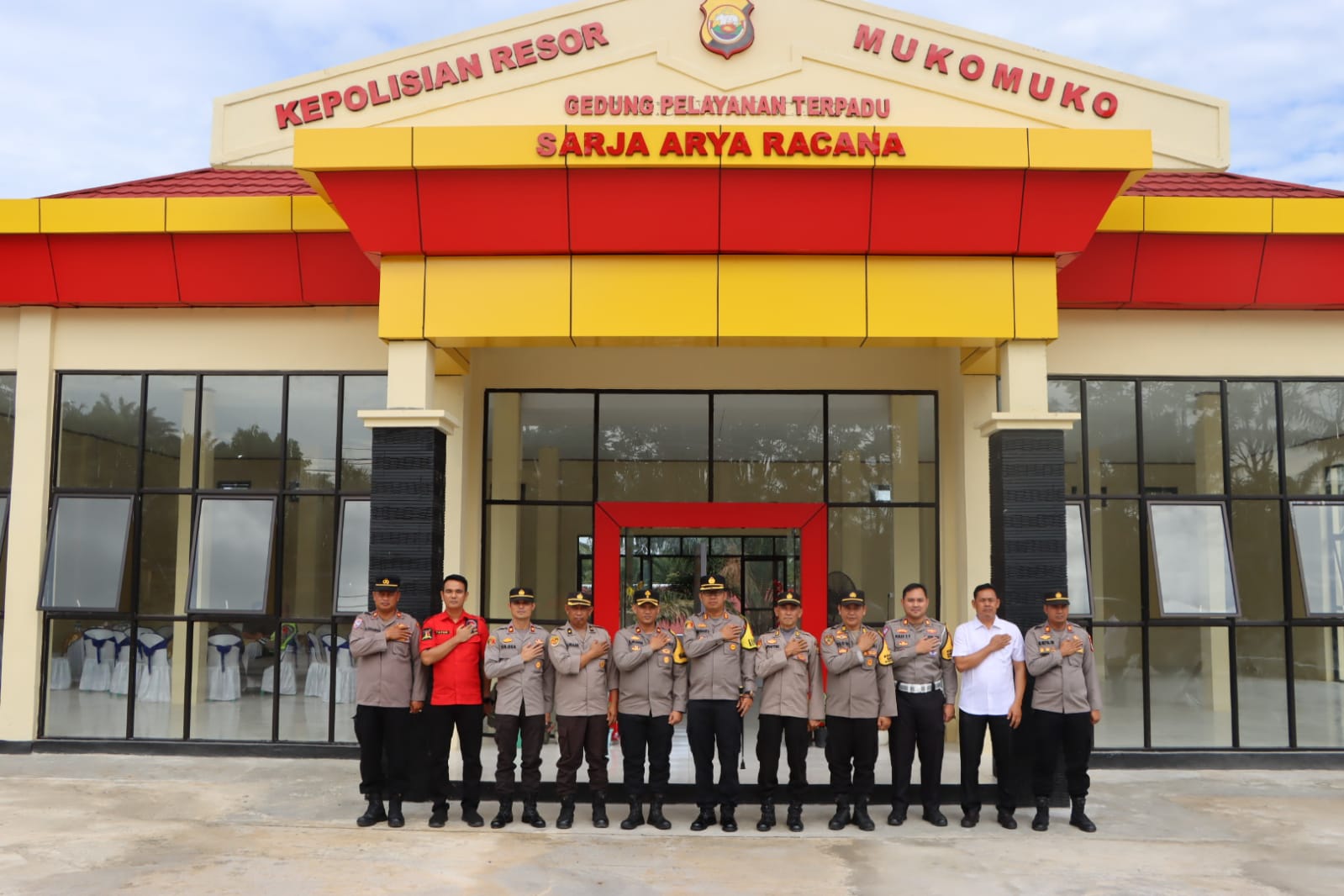 Kegiatan peresmian tersebut diawali dengan pembacaan doa untuk berkahnya acara itu yang dibawakan oleh Ustadz Bayu, kemudian dilanjutkan dengan pengguntingan pita Gedung Pelayanan Terpadu Satu Atap dan Penandatanganan Prasasti serta dilanjutkan dengan pemotongan tumpeng oleh Kapolres Mukomuko yang diberikan secara simbolis kepada Wakapolres Kompol Ahmad Musrin Muzni SIK MH dan kepada Kepala Dinas PUPR Kabupaten Mukomuko Apriansyah ST MT yang berlangsung dalam suasana akrab dan penuh kekeluargaan.