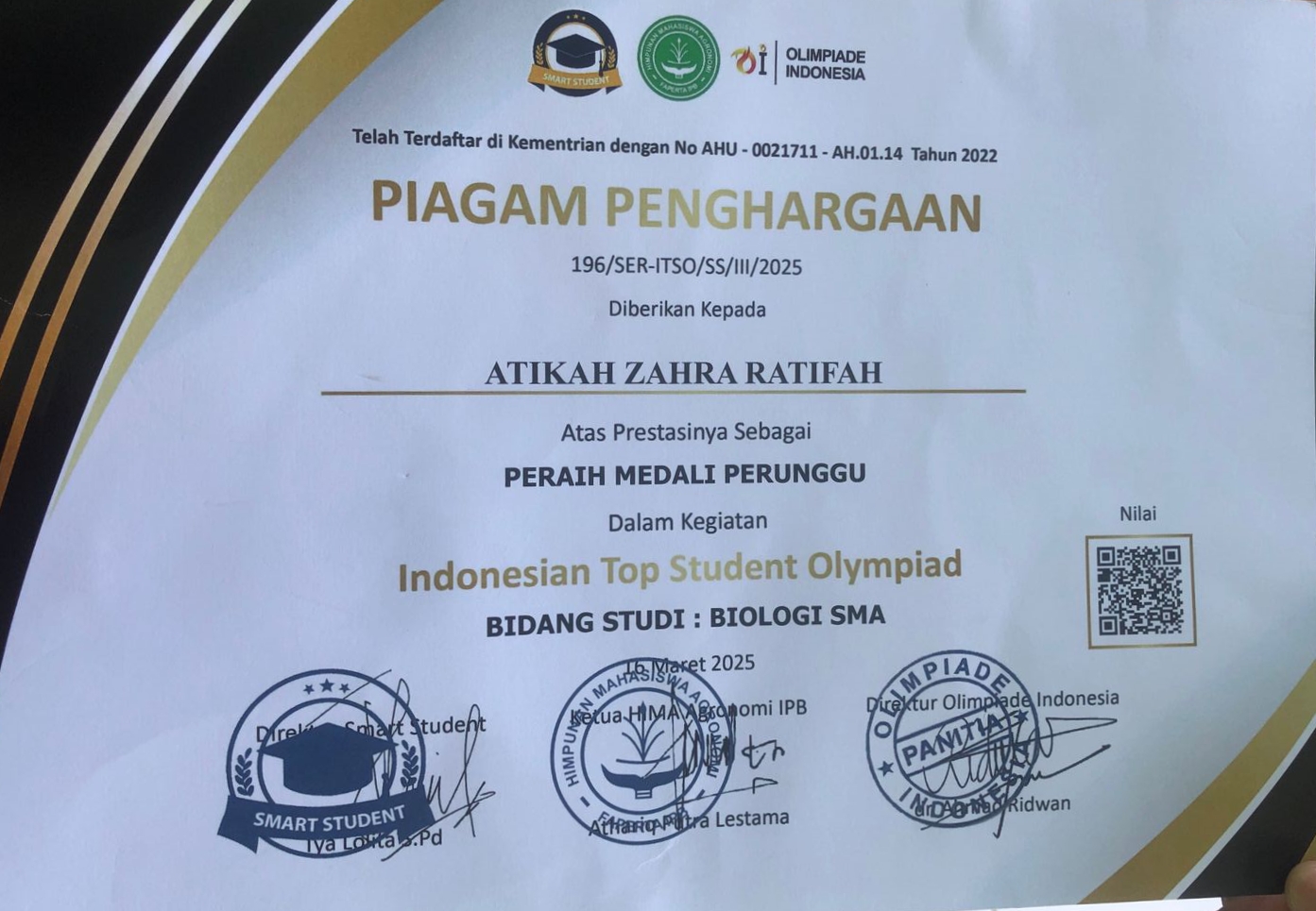 Kabar Pendidikan – Prestasi membanggakan kembali ditorehkan oleh salah satu siswa terbaik MAN 1 Mukomuko. Atikah Zahra Ratifah, siswi kelas X, berhasil meraih medali perunggu dalam ajang bergengsi Indonesian Top Student Olympiad (ITSO) 2025 bidang studi Biologi tingkat SMA.